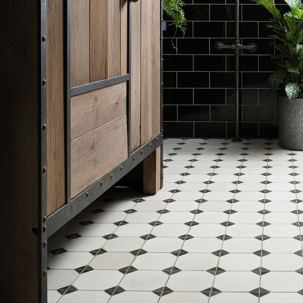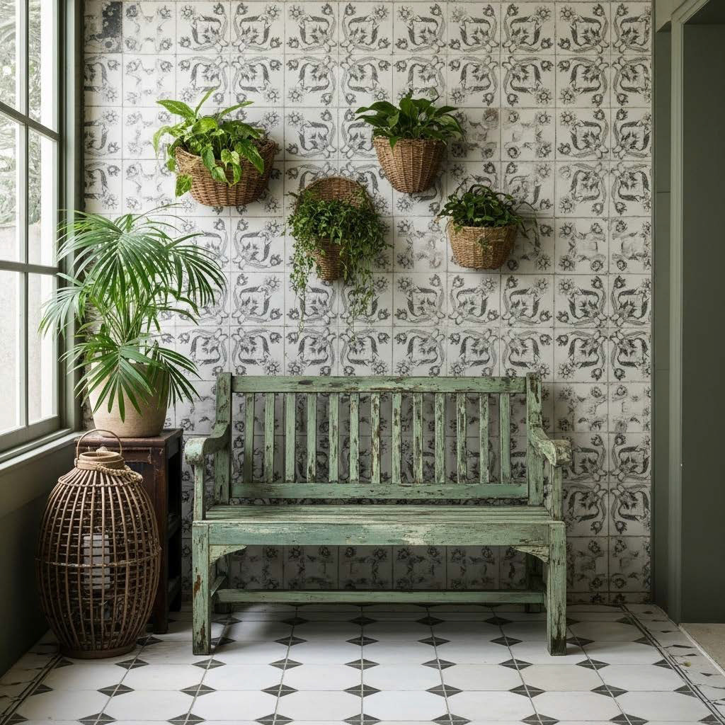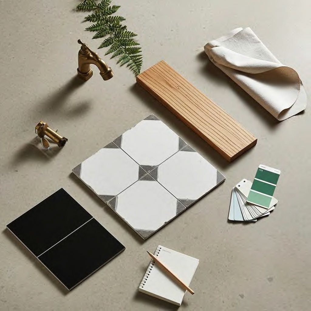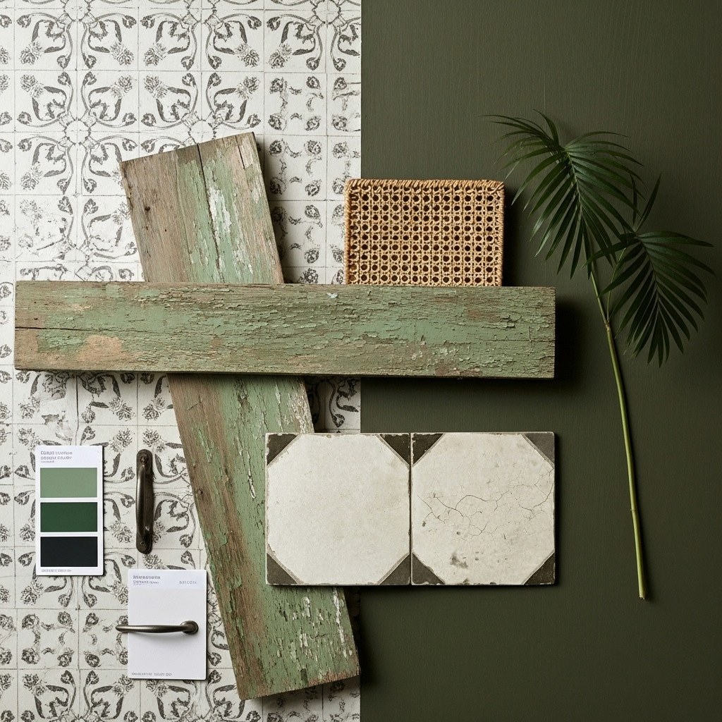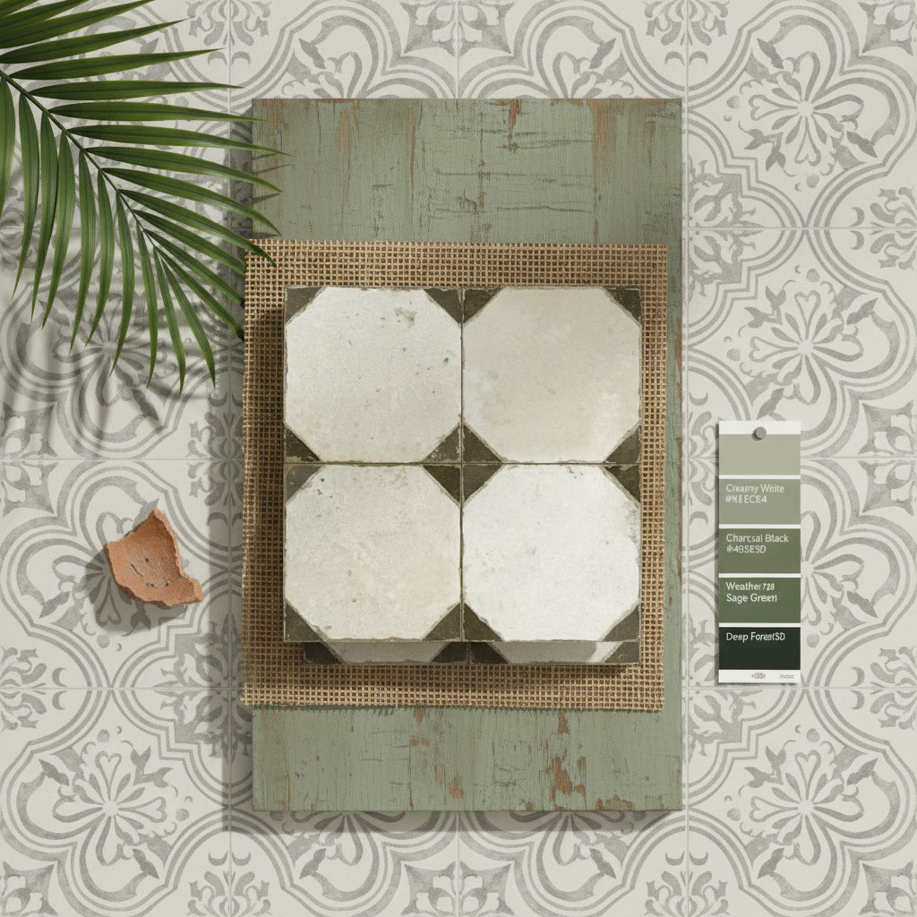 See how a single vintage tile inspires a complete visual narrative. Our production-grade workflows place this classic floor tile in a sunlit green courtyard and a rustic bathroom, supported by detailed mood boards to guide the design story.