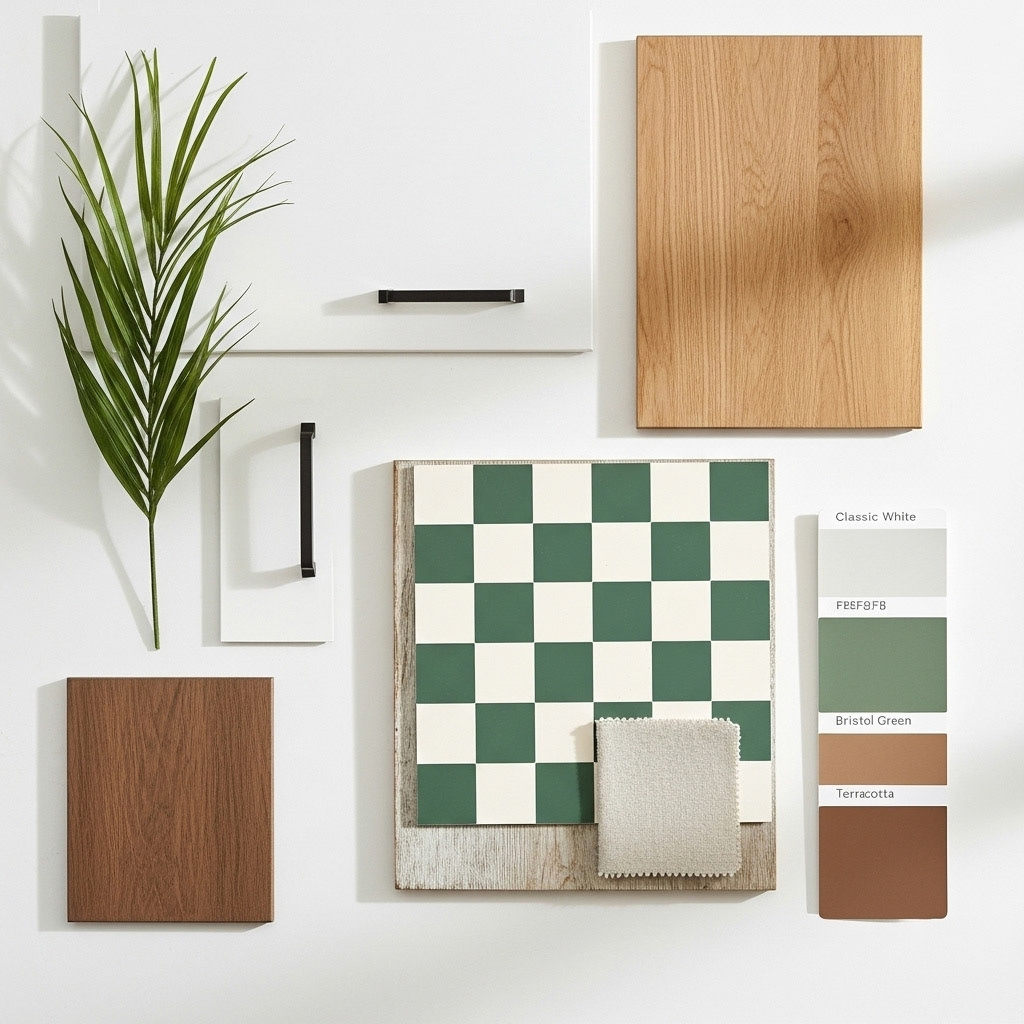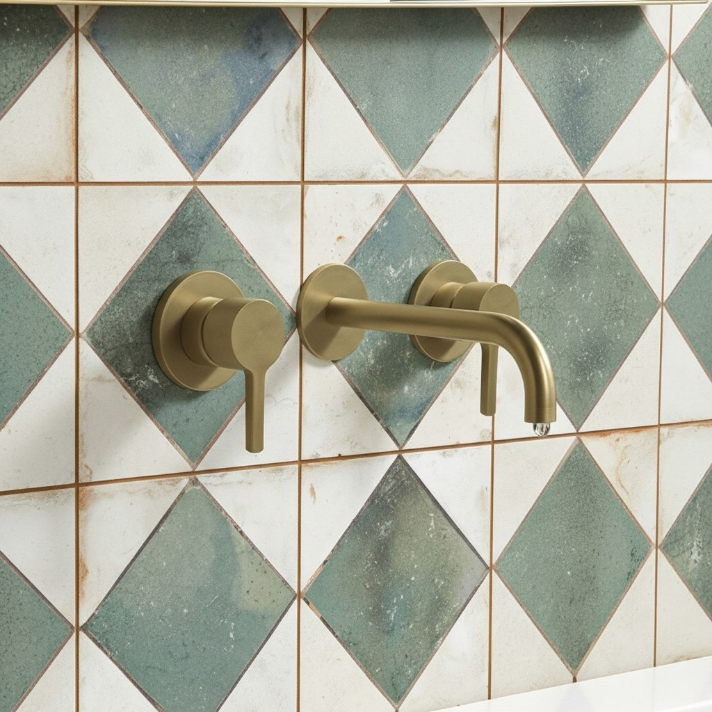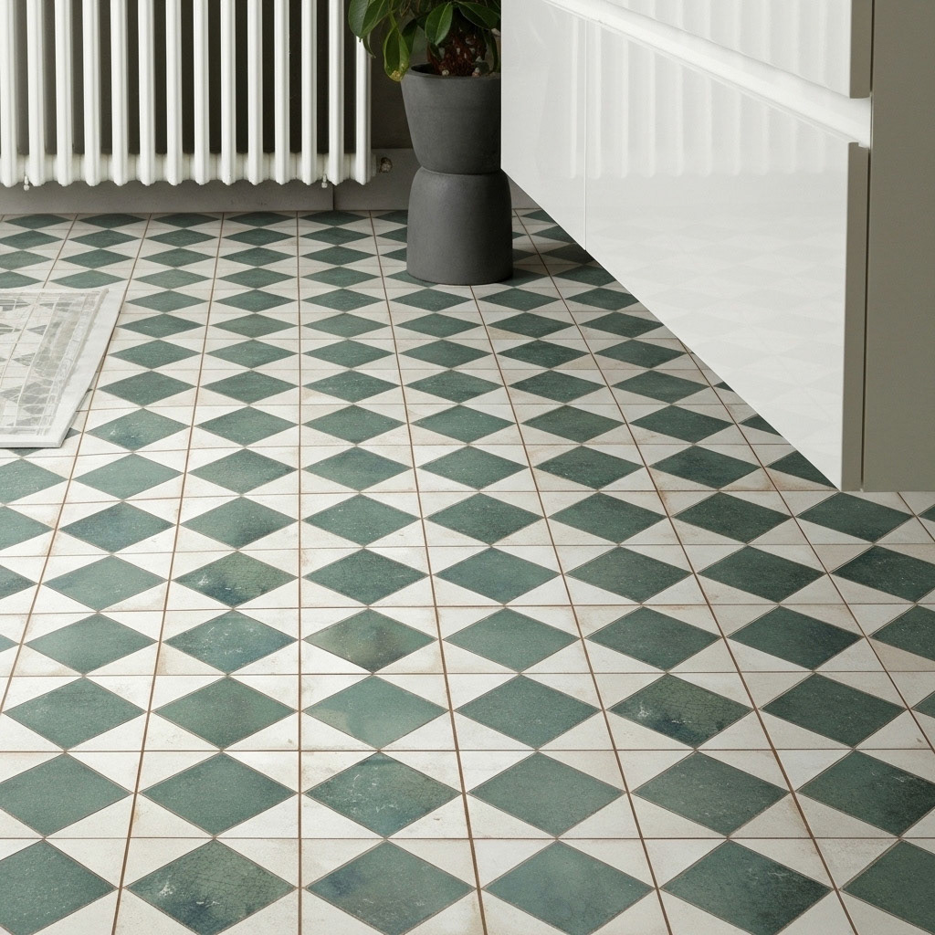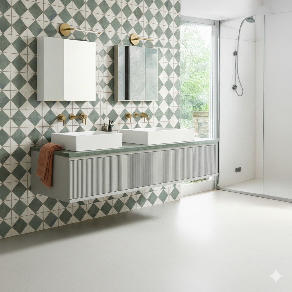 A vintage-modern bathroom where green diamond-patterned tiles cover the walls and floor. This classic, rustic look is expertly paired with a contemporary fluted vanity and brushed brass fixtures, showing a perfect blend of styles. Discover how our visualizations bring complex design concepts to life.