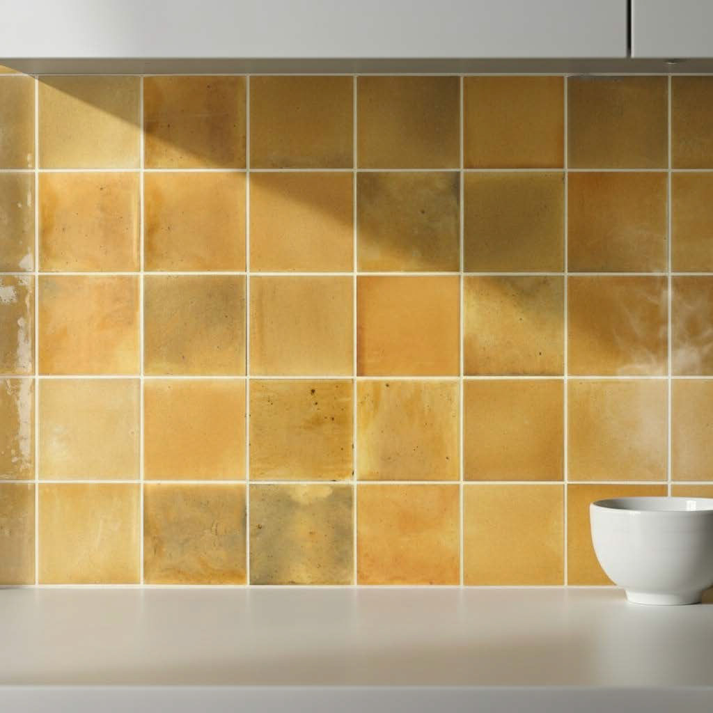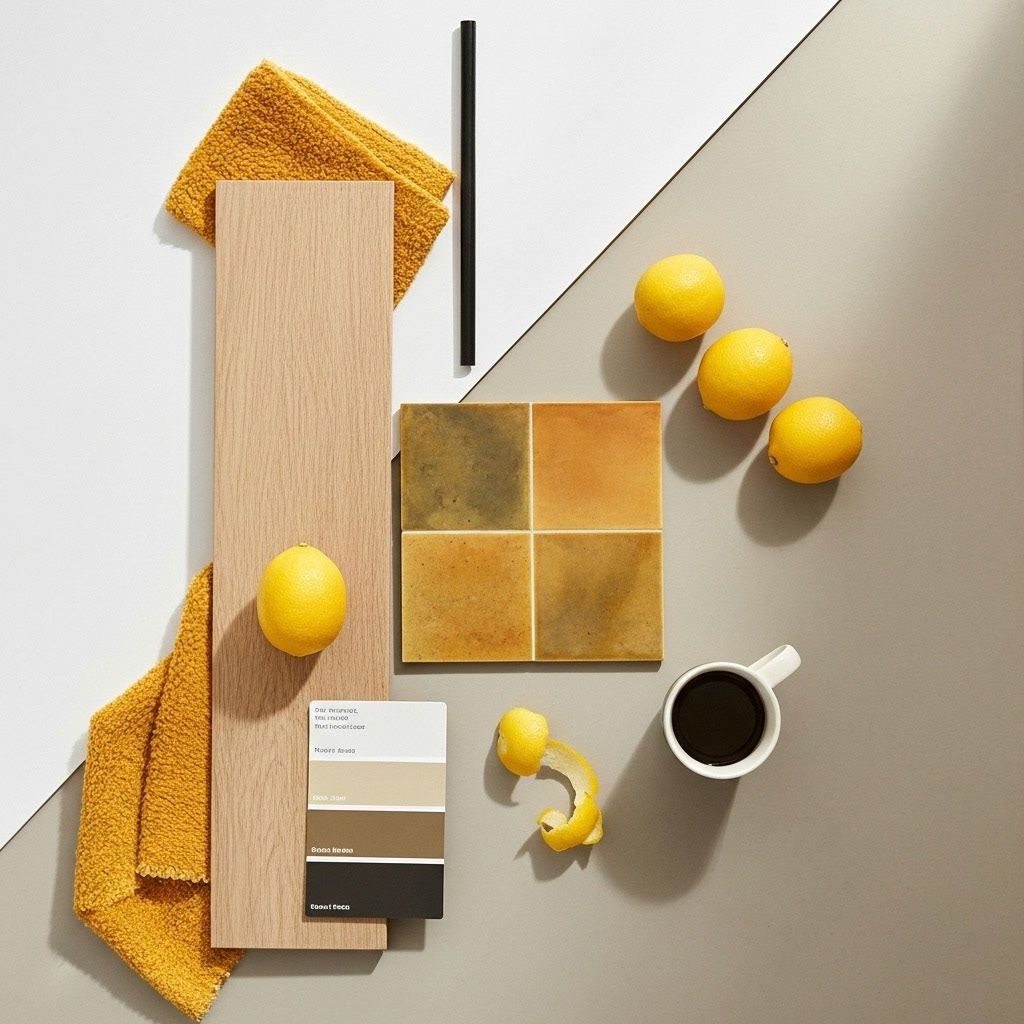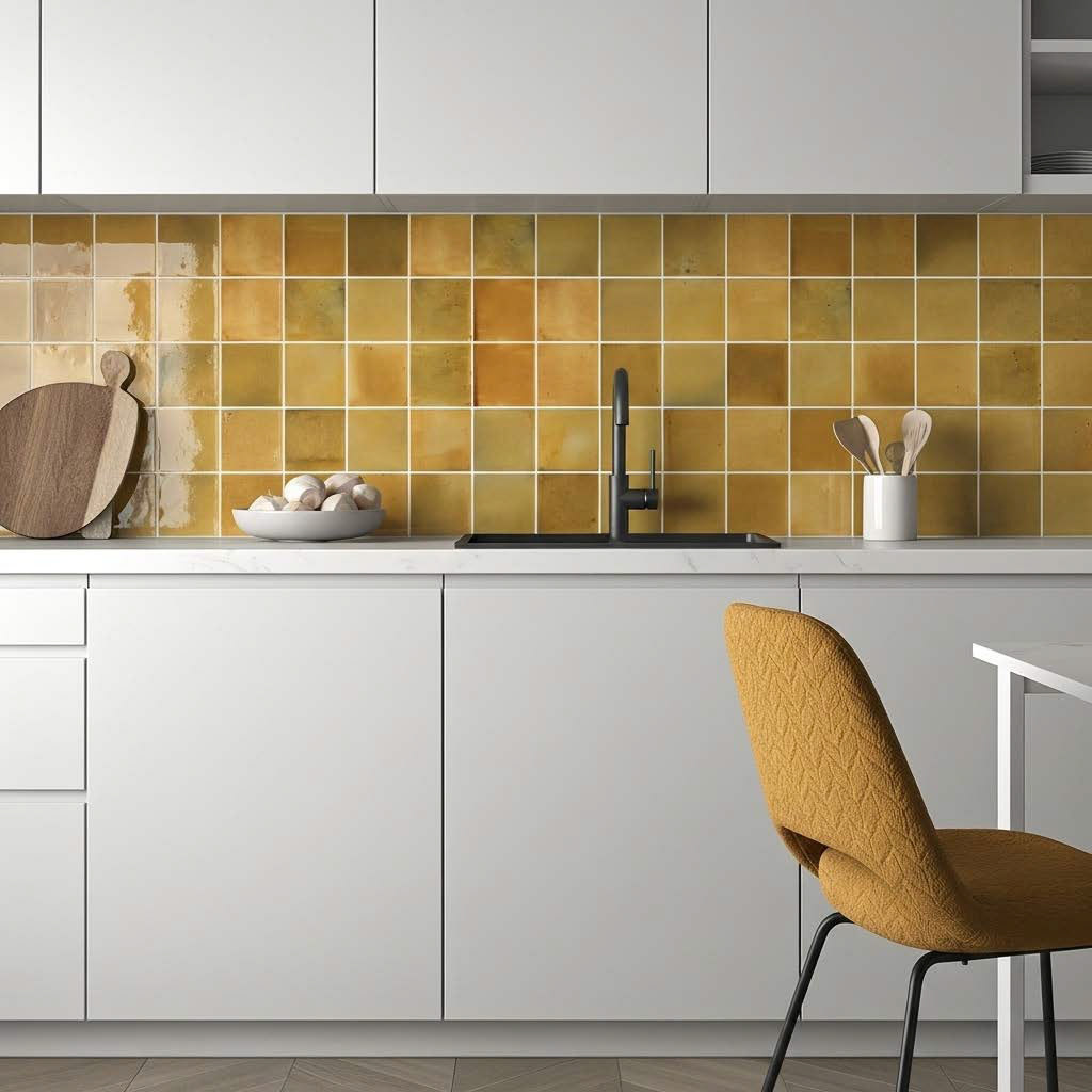 Discover a photorealistic yellow kitchen with a detailed terrazzo countertop and handleless cabinets. Our custom workflows excel at capturing the subtleties of materials, such as how natural light plays on matte surfaces, while also emphasizing the feature tiles.